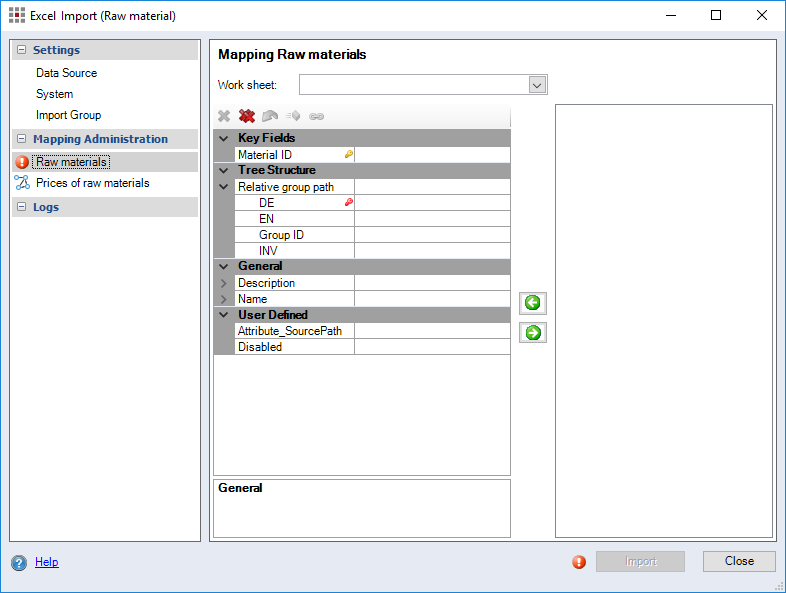 Figure: Excel Import (Raw Material) dialog, Mapping Raw Materials