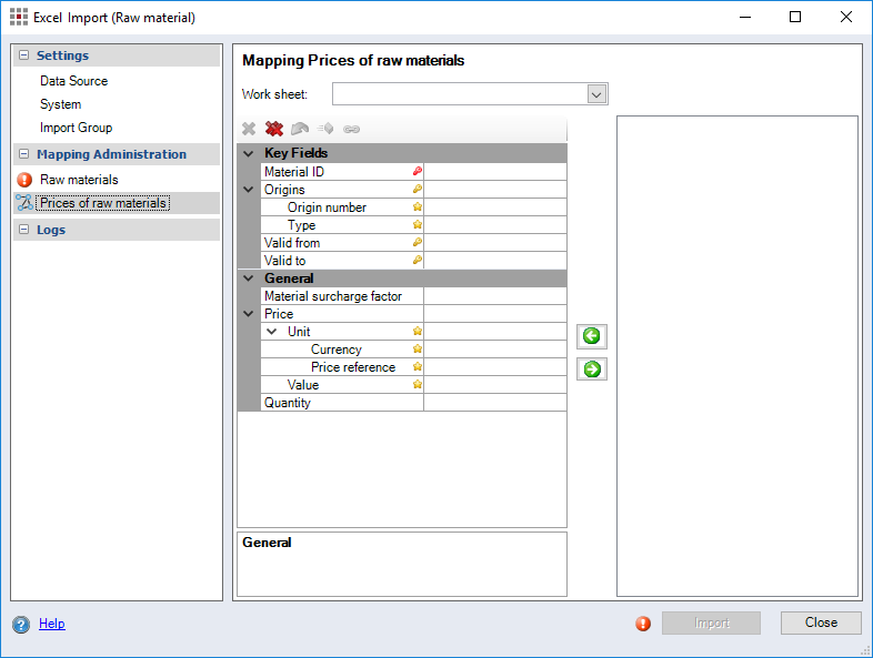 Figure: Excel Import (Raw Material) dialog, Mapping Prices of Raw Materials