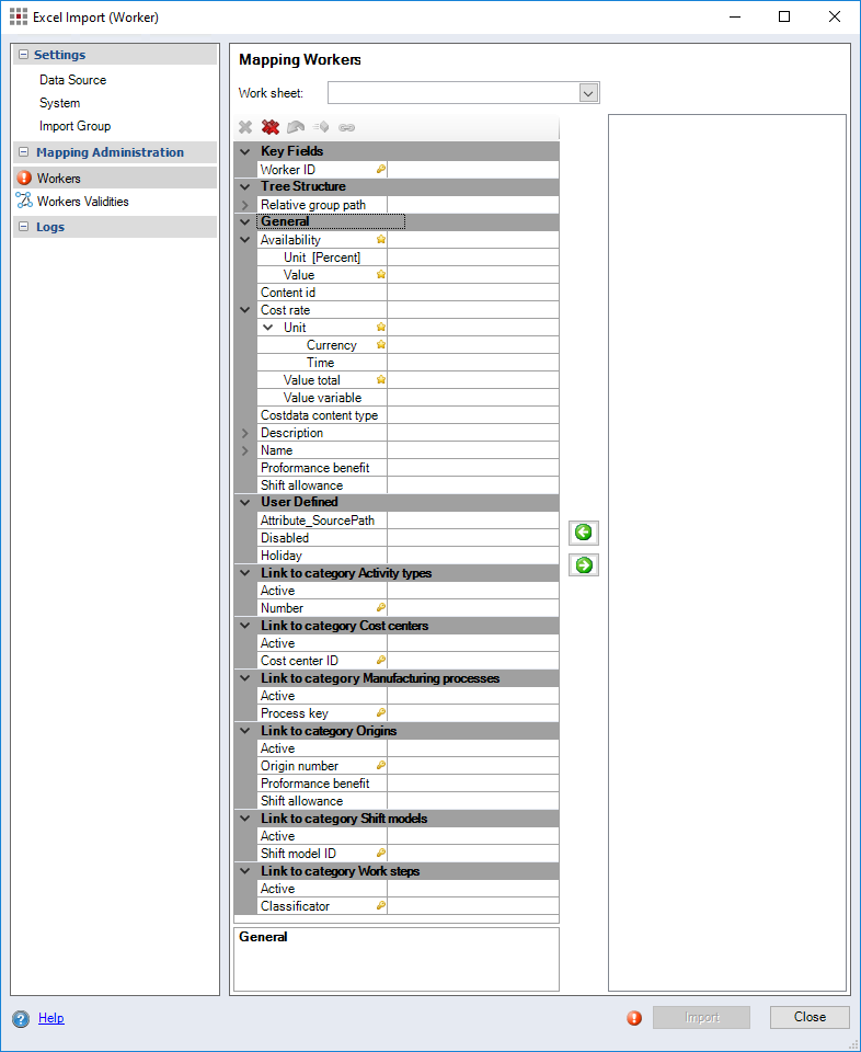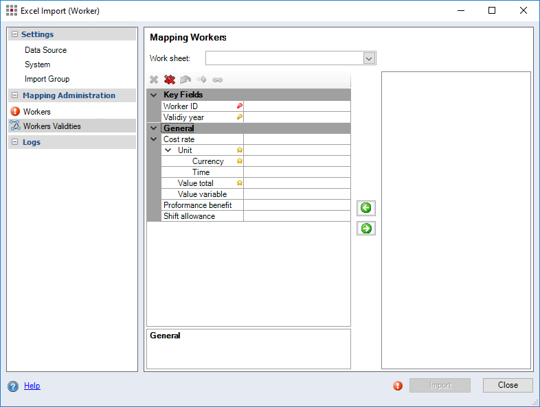Figure: Excel Import (Worker) dialog, Mapping Workers Validities