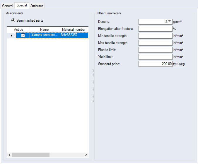 | Semifinished parts | Multiple semifinished parts can be added and multiple ones be actively assigned. Setting up such an assignment allows costs for the basic material that are based on the validity period to be entered for the semifinished part. |