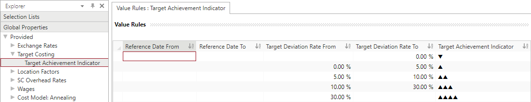 The target achievement indicator provides you with a quick overview on your target achievement. The higher the delta between target production cost and production cost, the more target achievement Indicators are shown.