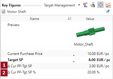 In the »Target Management« view schema of the Key Figures view, you can enter the current purchase price as well as the target costs for Sales Prices (Target SP). You can analyze the effects of changes in the percentages via the target profit rates on raw materials, purchased materials and manufacturing.