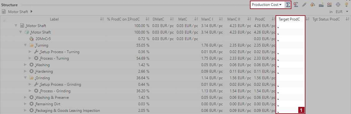 In FACTON, you can specify the target costs for Sales Prices (Target SP), for Production Costs (Target ProdC) or at individual elements. This way, you may check if the development is still within target costing range.