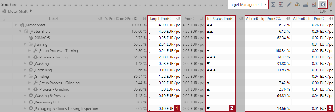 The »Target Management« view schema provides an overview of the production costs alongside your BoM.