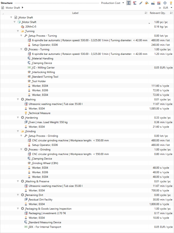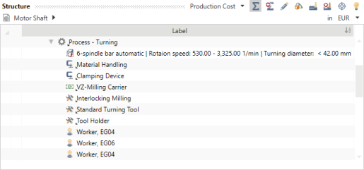 In this section, additional calculation elements required to calculate the costs will be inserted into and specified within the inserted processes for the »Motor Shaft«.