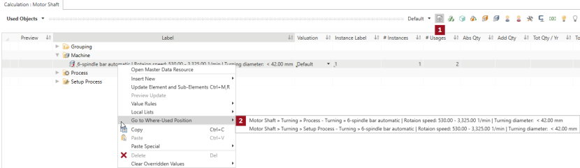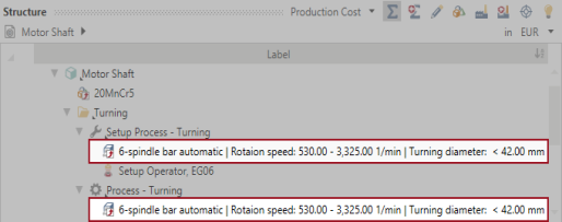 In the Used Objects view, you can verify whether you have used the same machine for »Setup Process - Turning« and »Process - Turning«. The following two points indicate this: