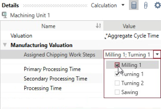 2. In the Details ► Calculation ► Manufacturing Valuation ►, click on the combobox next to Assigned Chipping Work Steps.