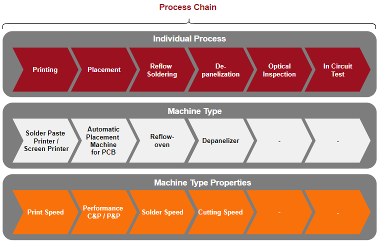 In order to visualize the individual processes of the process chain, insert all of the required machines under the »Circuit Board Assembling« process. Each individual process contains a certain machine type and a manufacturing process with specific process properties. The diagram shows the process chain with all individual manufacturing processes and their machine properties: