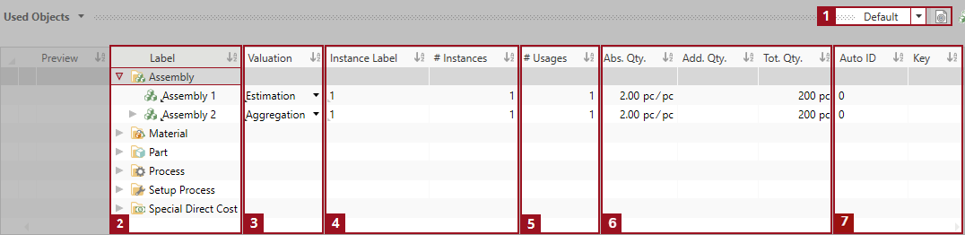 The Used Objects view (former: »Local Inventory«) shows all calculation elements that are used in the Structure view. Relevant properties and values of the calculation elements are displayed, which you can check and quickly edit in this view.