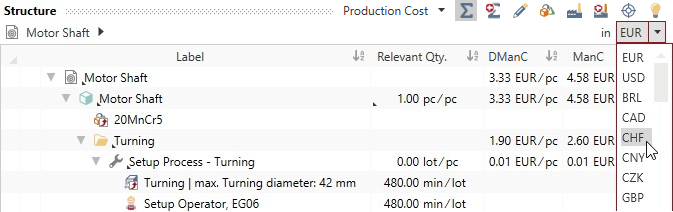 - Click on the combobox »in <Currency>» above the calculation structure.